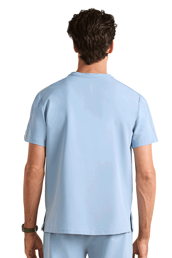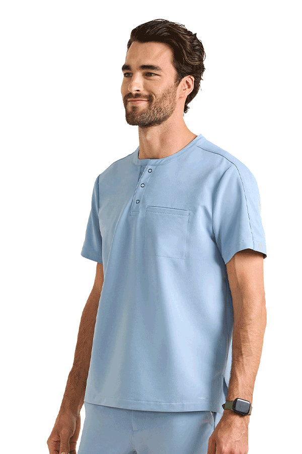 he Men's Shane Scrub Top offers modern style with a Mandarin collar, snap closure, 1 chest pocket, side vents, and eco-friendly fabric made from 8 plastic bottles.