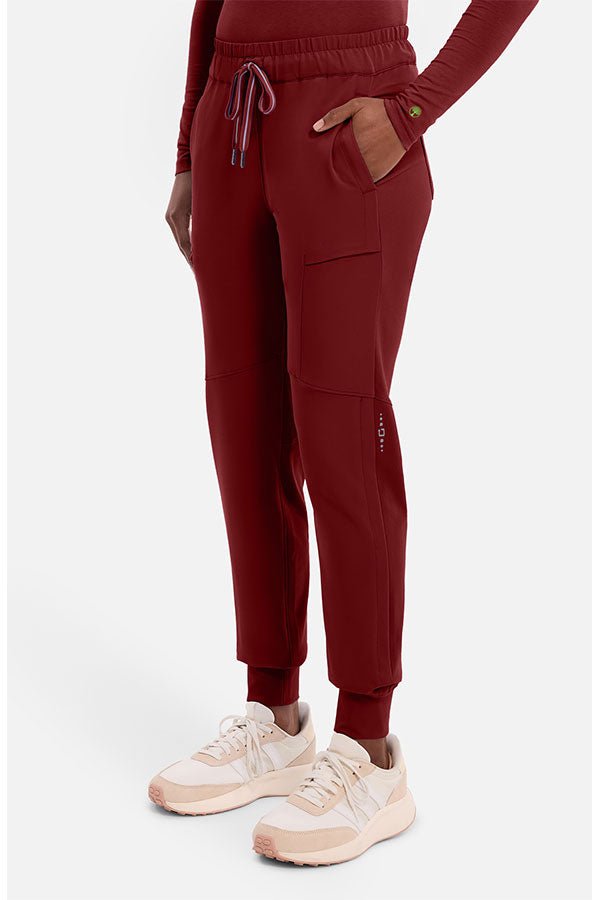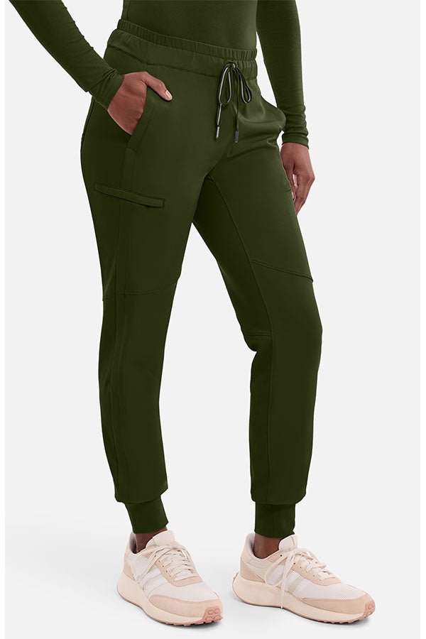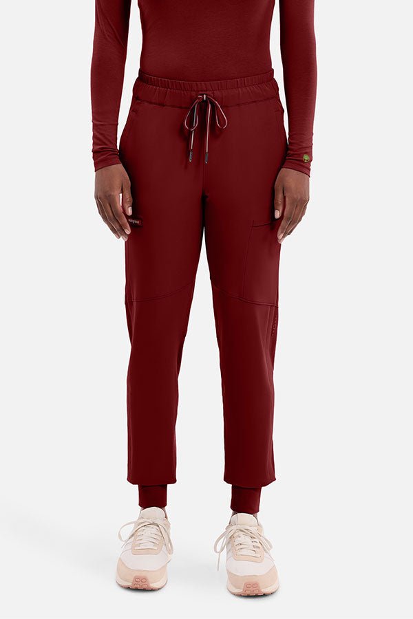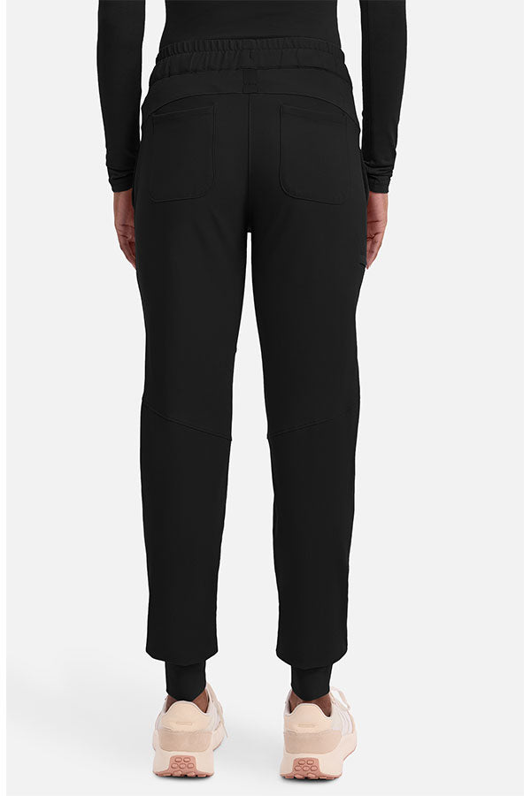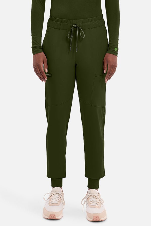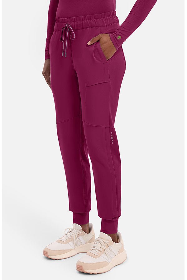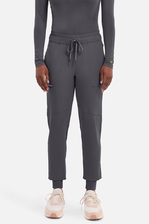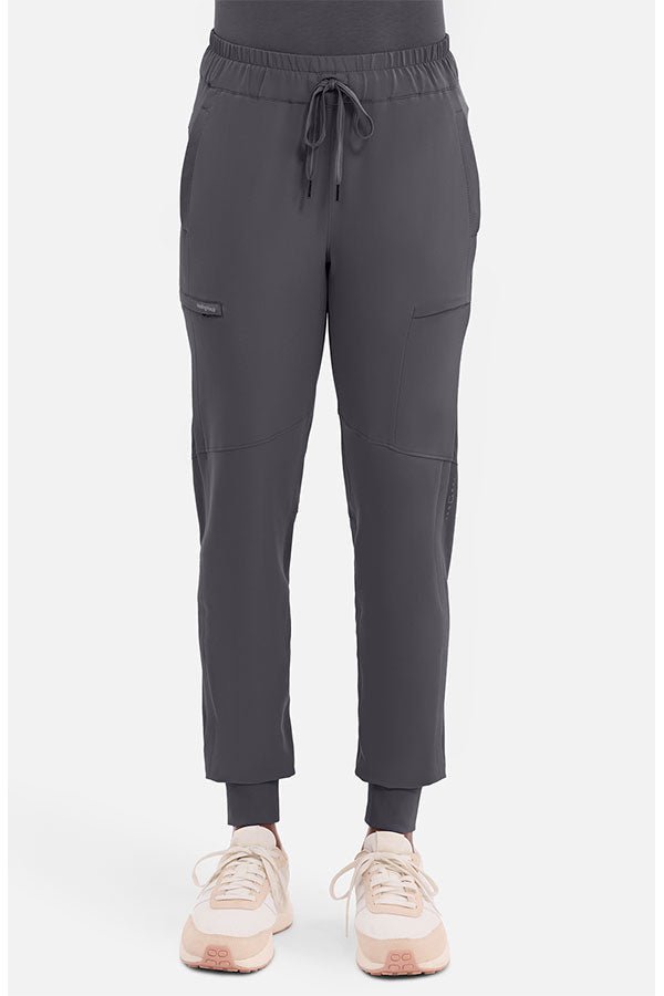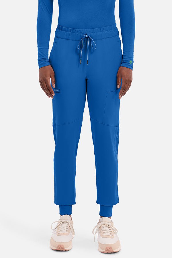 56% recycled polyester, 36% polyester, 8% spandex Diamond weave 4-way stretch Textured knit trim: 92% nylon, 8% spandex Moisture wicking