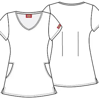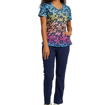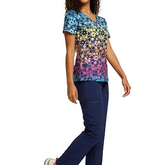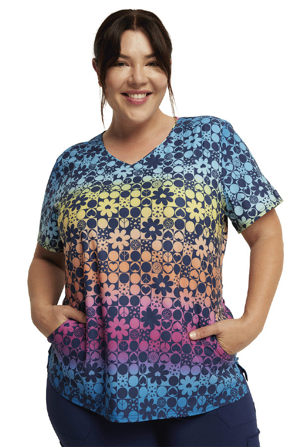 A contemporary fit v-neck print top features two patch pockets, back darts for fit and shaping, and side vents. Center back length: 26".